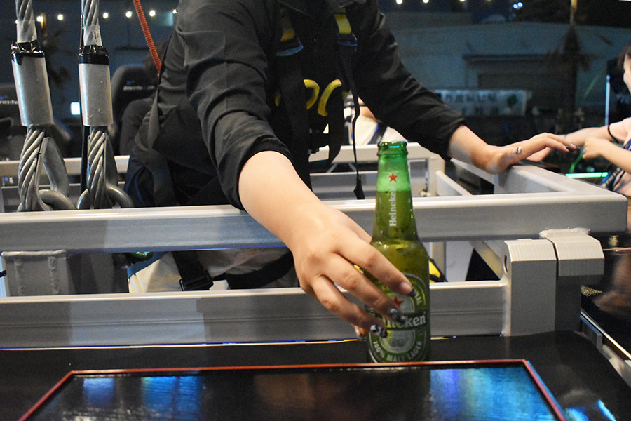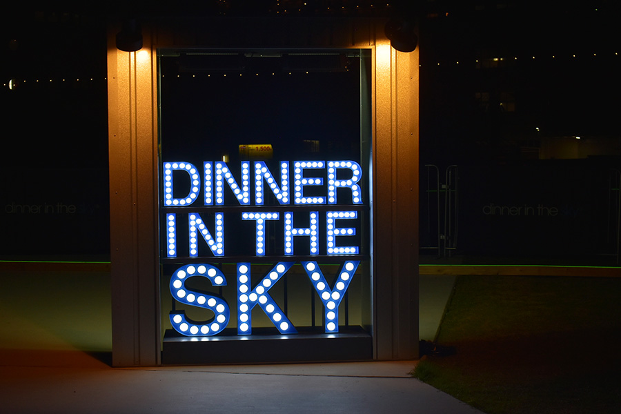 会場に入ると、さっそく大型ゴンドラのようなものがクレーンから吊り下げられている様子が目に入る。ちょうど日が沈んだばかりということもあり、色とりどりに光るレストランはなんともメルヘンで、下から見る限りではまだ怖さは感じない。これなら余裕だ!と乗り込むと、まずは厳重にシートベルトで固定される。そして徐々に上昇していくのだが、高さに比例してじわじわと恐怖心が増していく。