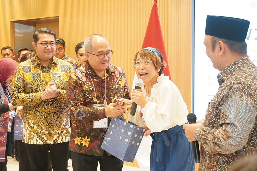 108回インドネシアパビリオンに訪れたという、みっちゃん(左)にプレゼントが贈られた(10月13日/インドネシアパビリオンにて)