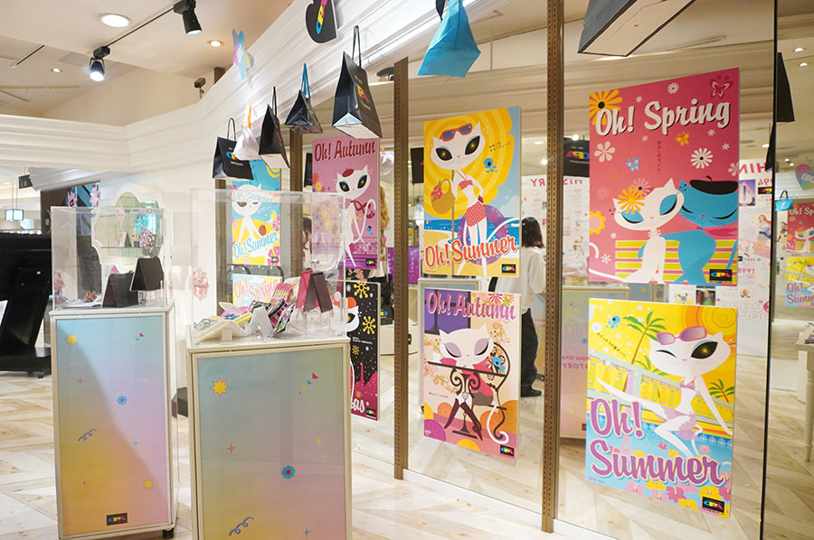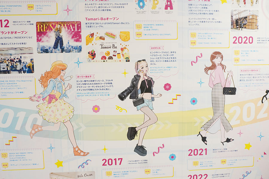 時代ごとに流行ったファッションを身にまとった女の子のイラストが印象的な年表で、1994年〜現在に至るまでの同施設の変遷や、その時代に流行ったものなどが細かく記載されている。じっくり読み込みたくなる情報量で、よく見てみると同施設は31年で何度かリニューアルをおこなっていたことや、関西初出店のブランドが多かったこと、またブランド第一号店が誕生していたことなどが分かる。