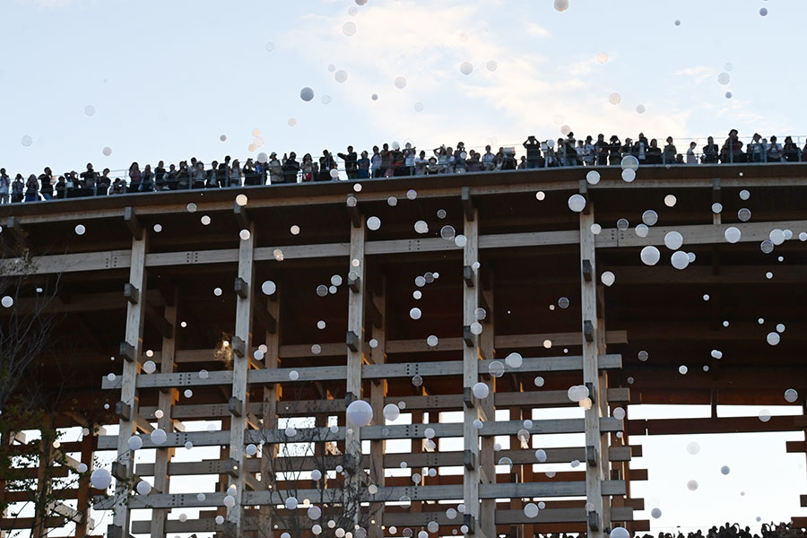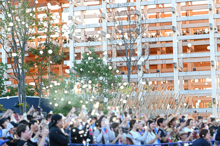 フラッグパレードはEXPOアリーナ「Matsuri」でのセレモニーのあと、西ゲート広場をスタート地点に、協会役員、プロデューサー、スペシャルサポーターたちなども参加するというフィナーレにふさわしい豪華な内容に。ゴール地点のほか、一目見ようと大屋根リング上にも多くの人が集まっていた。