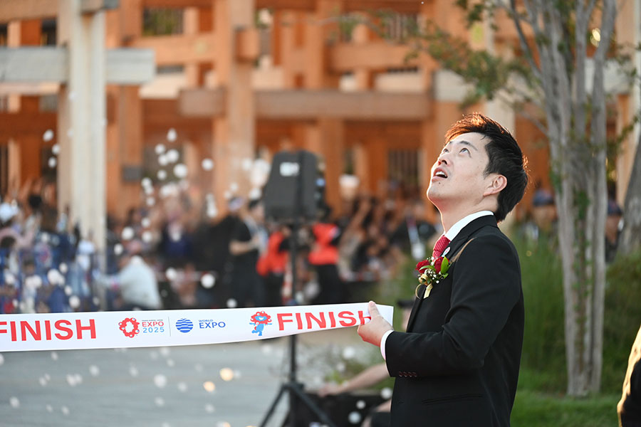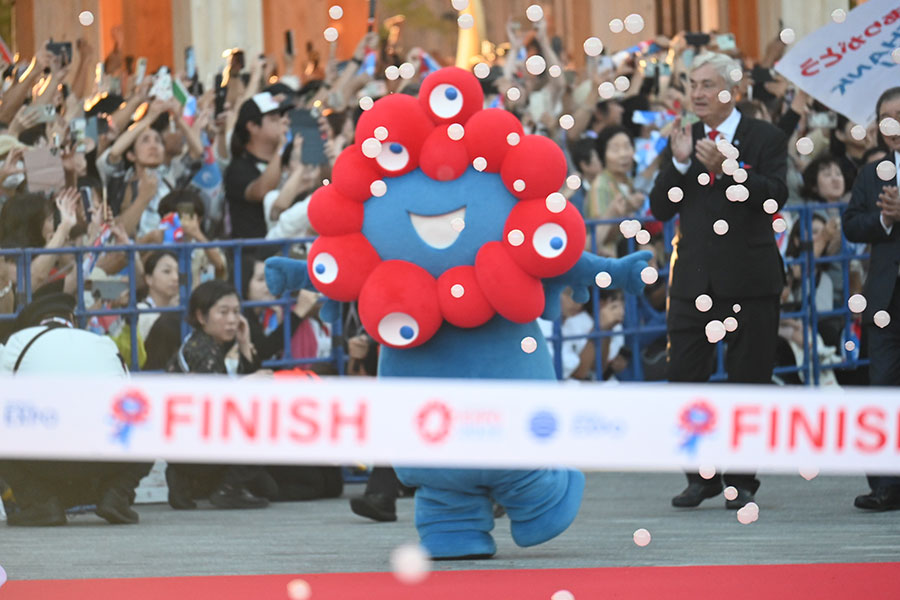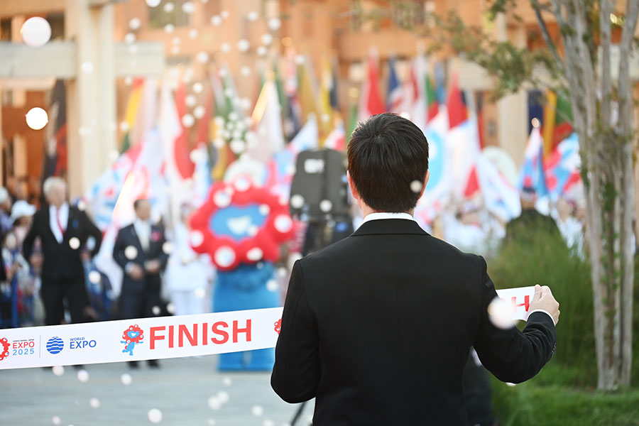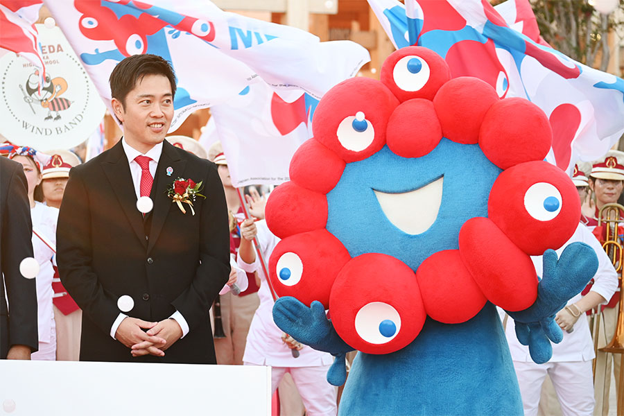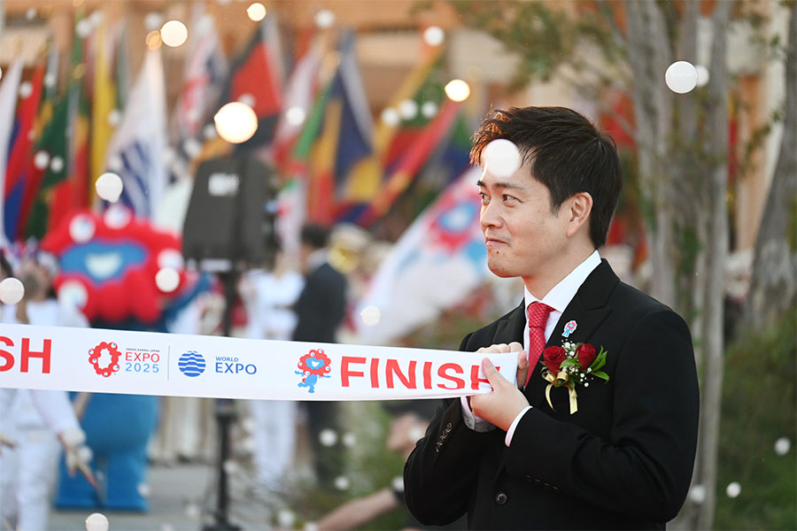 そして最後にゴールテープを持って待っていたのは、吉村大阪府知事と横山大阪市長。一足先にゴール地点に登場すると、集まった来場者から「ありがとうー!」との声が飛び交った。最後はミャクミャクが一礼をし、一気にゴールテープを切ると、一帯から大歓声が沸き起こった。