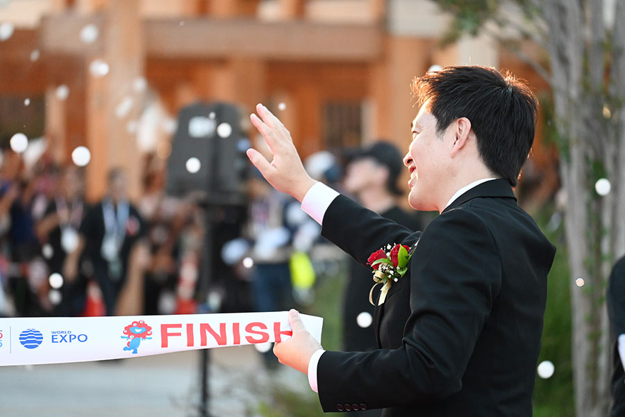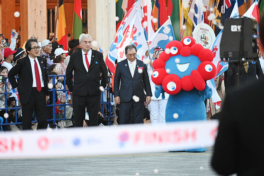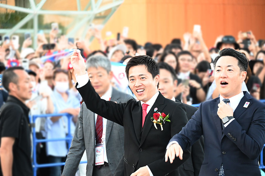 そして最後にゴールテープを持って待っていたのは、吉村大阪府知事と横山大阪市長。一足先にゴール地点に登場すると、集まった来場者から「ありがとうー!」との声が飛び交った。最後はミャクミャクが一礼をし、一気にゴールテープを切ると、一帯から大歓声が沸き起こった。