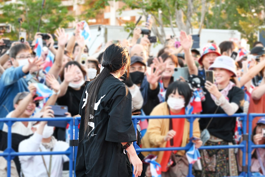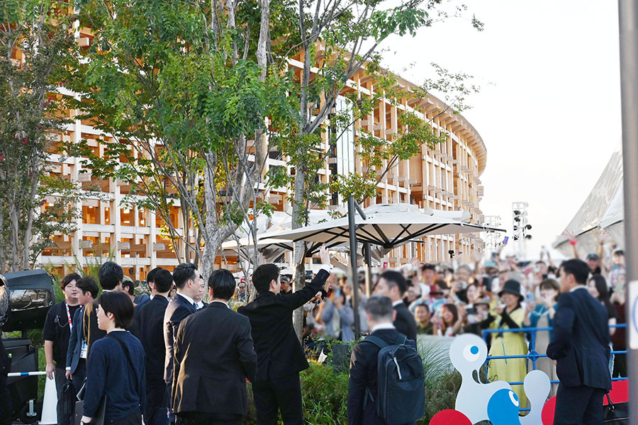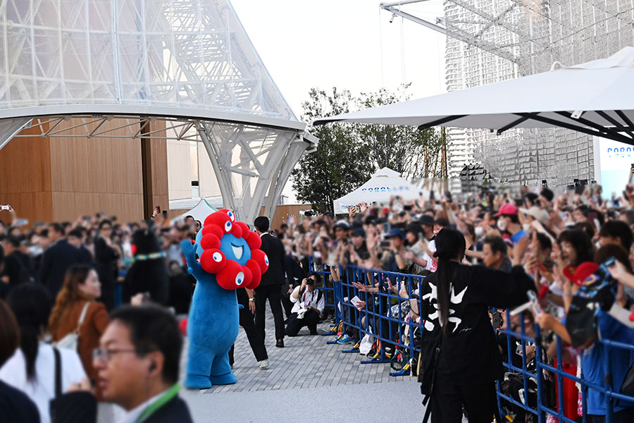 フラッグパレードはEXPOアリーナ「Matsuri」でのセレモニーのあと、西ゲート広場をスタート地点に、協会役員、プロデューサー、スペシャルサポーターたちなども参加するというフィナーレにふさわしい豪華な内容に。ゴール地点のほか、一目見ようと大屋根リング上にも多くの人が集まっていた。