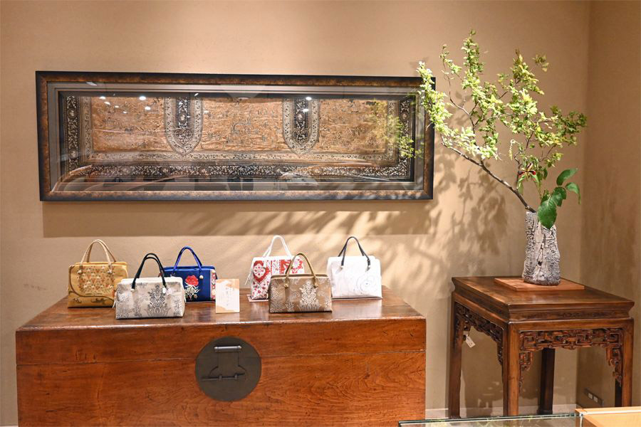 • 奥のサロンには、和装バッグやアンティークの髪飾りなどが品よく置かれています