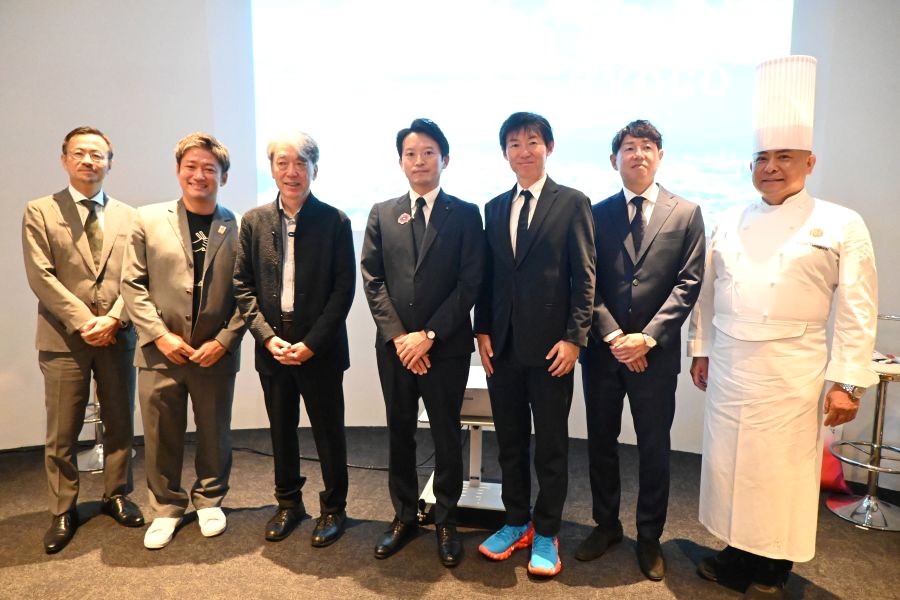 『ひょうごEXPO フィナーレ』1部出席者(左から)「六甲バター」マーケティング本部事業開発部長・中尾真範氏、「まねき食品」竹田典高社長、パビリオンアドバイザー・橋爪紳也氏、斎藤元彦兵庫県知事、「ケンミン食品」高村祐輝社長、「トーマス」政次裕也社長、「神戸北野ホテル」山口浩総料理長(10月11日/大阪・関西万博 Lmaga.jp編集部撮影)