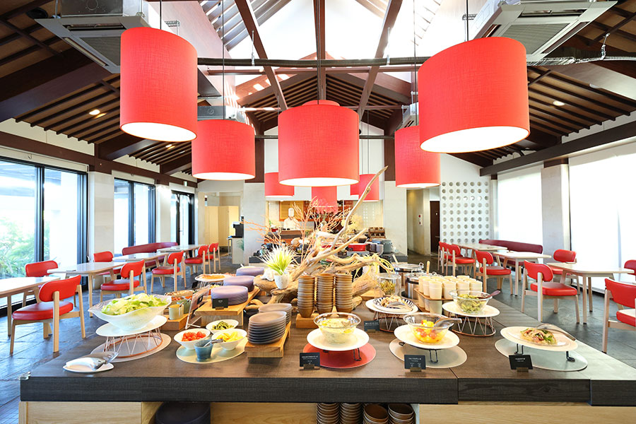 ここは八重山諸島で唯一18ホールを有する広大なゴルフ場で、施設内でも高台に位置している。海の向こうの西表島まで見通せる特等席だ。ディナーは夕方に開始。杯を重ねるごとに刻一刻と空が赤く染まり、海の向こうに夕日が落ちてゆく様に目を奪われる。