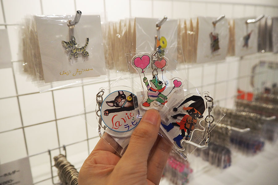 • グッズ売場では、アクリルキーホルダーなどの雑貨、文具などを販売