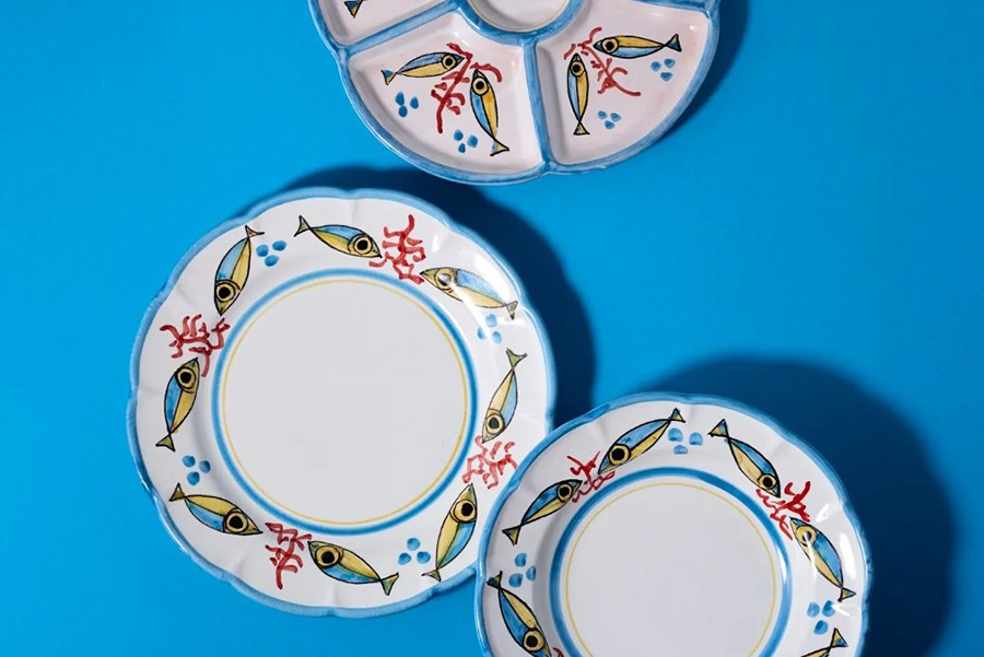 • 『イタリアフェア2025』に登場する「ロモロ アピチェッラ」の前菜プレート(直径約25.1x25.4cm1万2100円)、ディナープレート(直径約25.5✕H3cm5500円)、パスタブレート(直径約23✕H4cm5500円)。祝祭広場「スプレンデ」にて