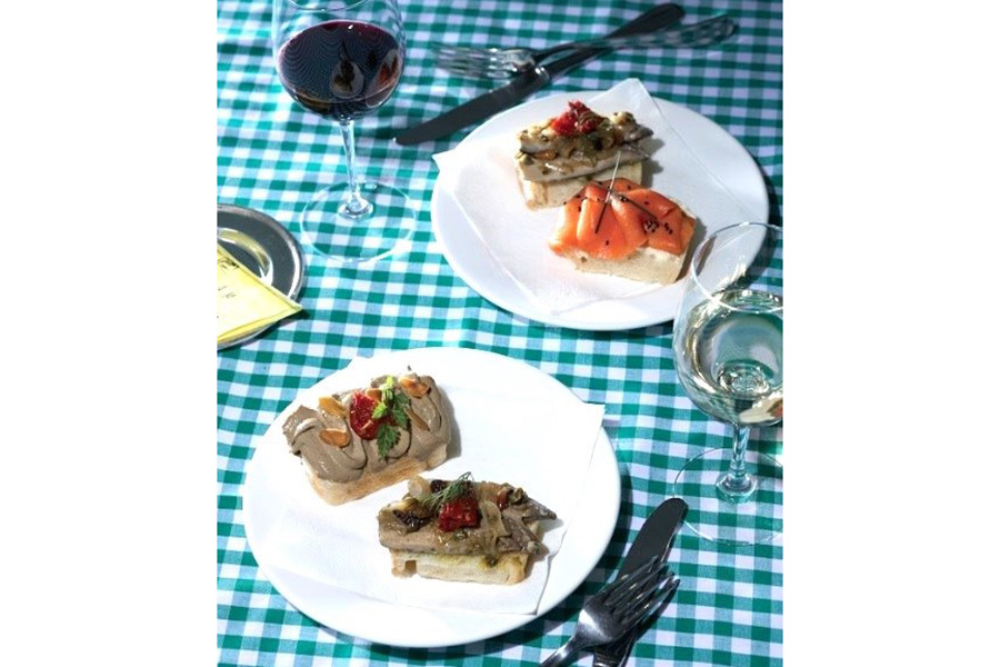 • 上から、『イタリアフェア2025』に登場する「バーカロ アル ポンピエーレ」の鶏レバーのムースをのせた田舎風パンのクロストーネ(451円)、特製バターとスモークサーモン ゴマのパニーノ(501円)、サオール風ソースのイワシ(501円) など