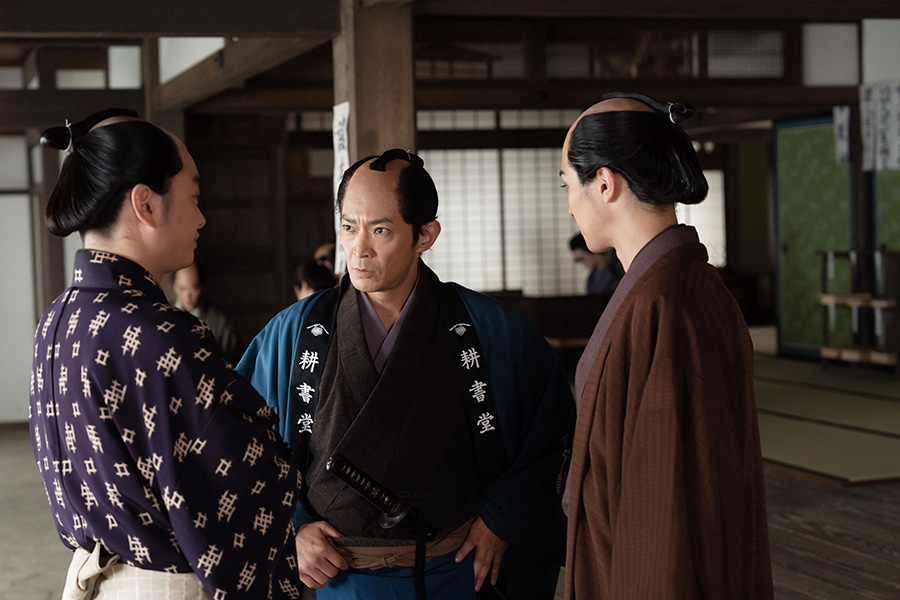 • 『べらぼう~蔦重栄華乃夢噺~』第41回より。絵師・喜多川歌麿(写真左、染谷将太)に男色ではないかと指摘する滝沢瑣吉(写真中央、津田健次郎)と、その様子を見る重三郎(写真右、横浜流星)(C)NHK