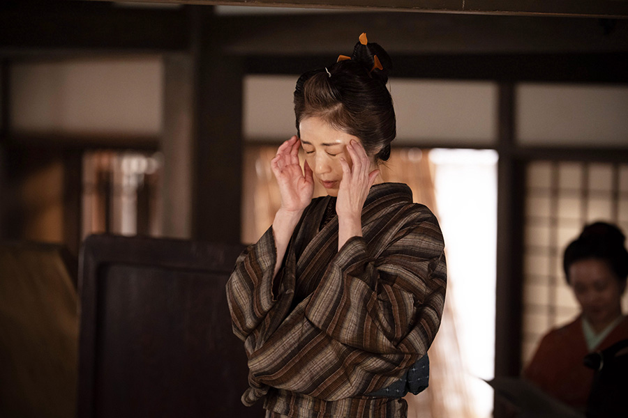 • 『べらぼう~蔦重栄華乃夢噺~』第41回より。頭痛がする重三郎の母・つよ(高岡早紀)(C)NHK