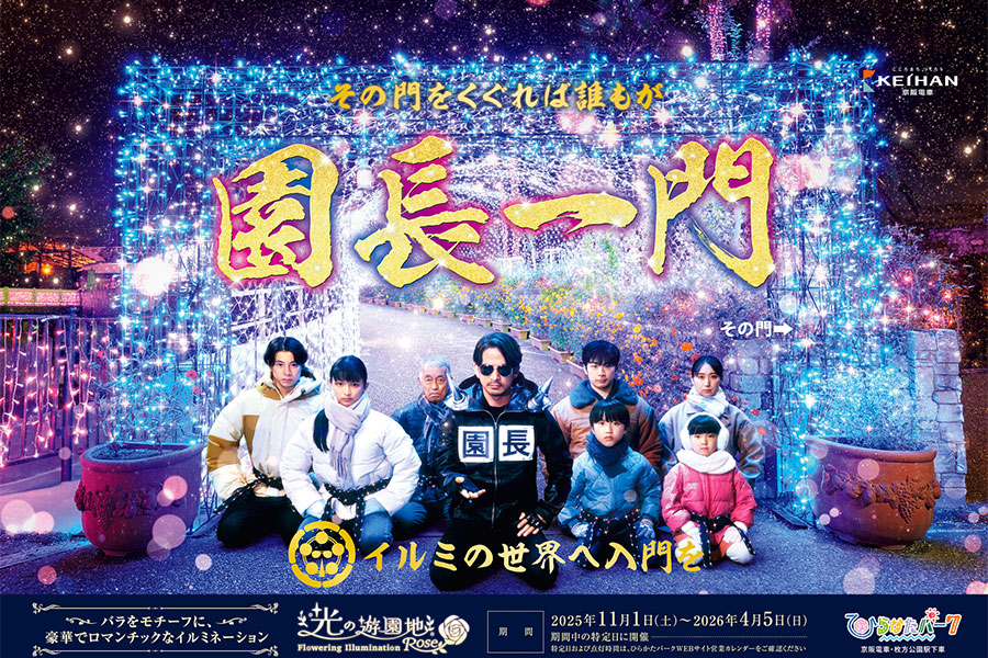 CMの見どころについて、担当者は「この世でいちばんイルミと程遠いものが、気合いかもしれない。だが、新しい美は対極にあるものがぶつかりあって、渾然一体となったときにあらわれる。気合いでは右に出る者がいない園長だからこそ生み出せる、イルミと気合いの奇跡のマリアージュ。ひらパーのイルミでしか味わえない新食感をぜひお楽しみいただき、園長一門の誰もが欲しがる黒帯ならぬ「イルミ帯」を目指してひらパーに遊びにきてください」とアピール。
