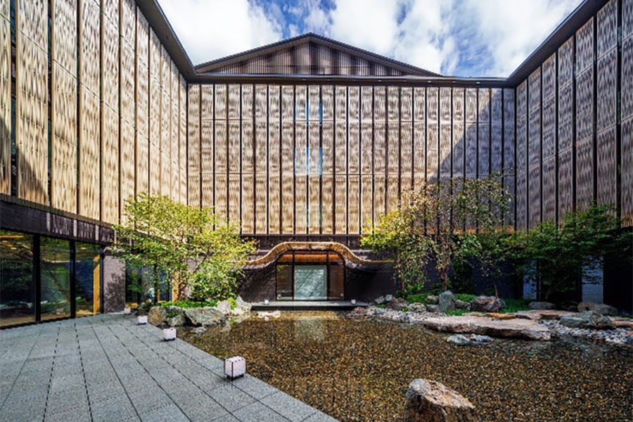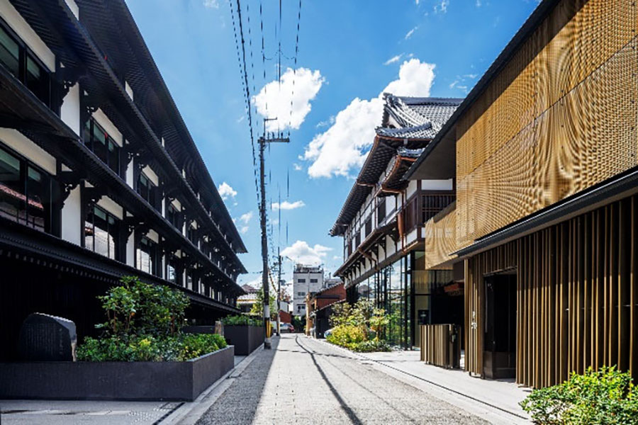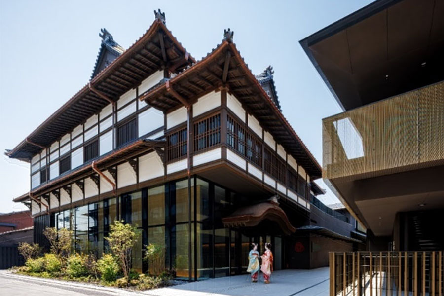 宮川町の⾵情漂う街並みと、東⼭の美しい景観との調和を図るため、既存建物の特徴を活かしたデザインとし、部材の⽣け捕りによる再活⽤を実施。また、宮川町のシンボルでもある「歌舞練場⼤屋根」を再建するなど、随所に街の記憶を継承した造りとなっている。