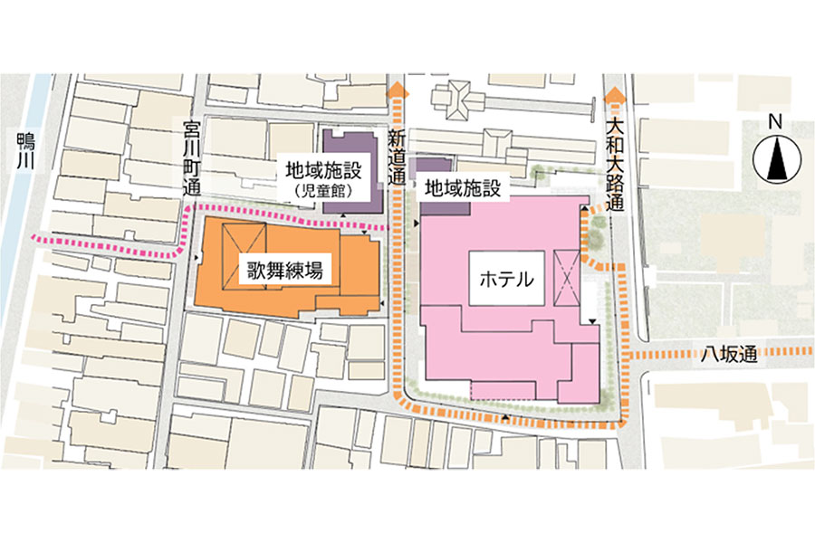 敷地全体では、ホテル・歌舞練場・地域施設の3施設を新道通に沿って整備し、⼤和⼤路通、新道通、宮川町通の南北の通りに対して、2つの建物を新しく配置することで、東⻄に新たな⼈の流れを⽣み、地域の回遊性を⾼める狙いだ。