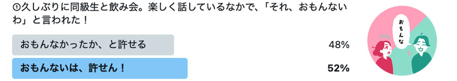 (1)久しぶりに同級生と飲み会。楽しく話しているなかで、「それ、おもんないわ」と言われた! 許せる? 許せない?