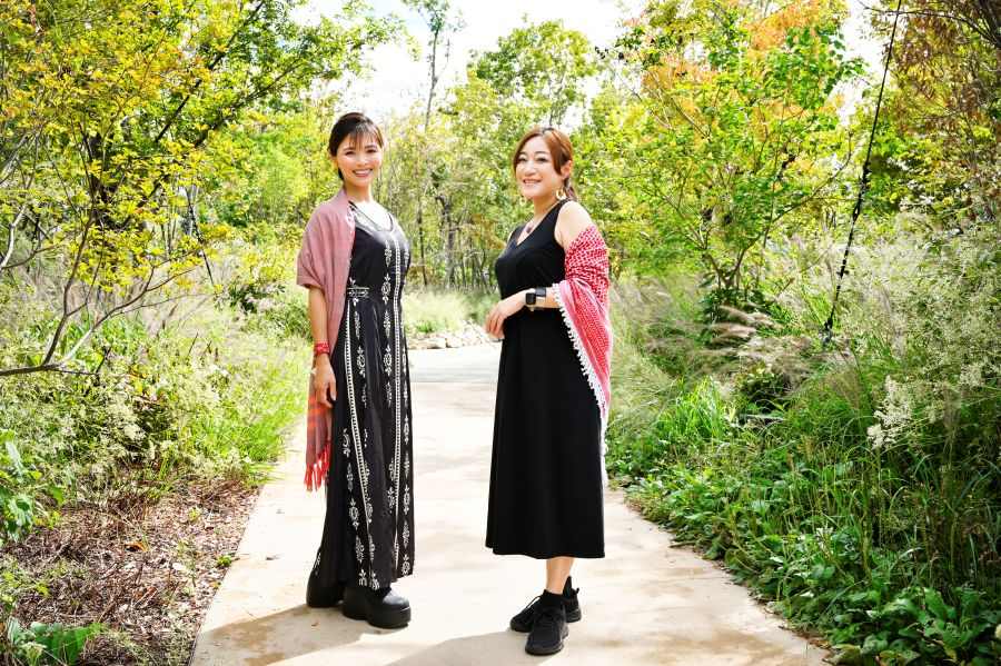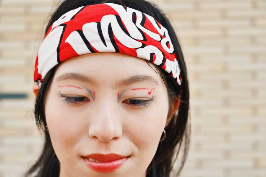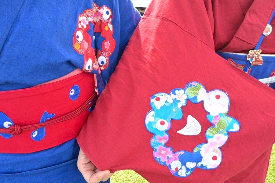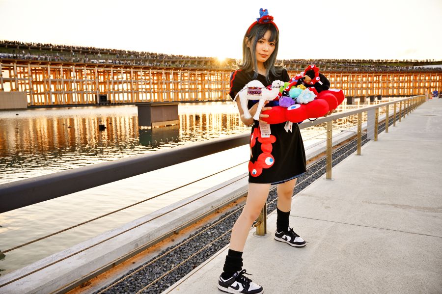 EXPOアリーナ「Matsuri」のイベント『ありがとうと旅立ちの祭典』で、和装で日本酒を楽しんでいるところをキャッチしたふたり。赤と青の着物には、それぞれ細部までこだわりを感じるオリジナルのミャクミャクや「こみゃく」をデザイン。万博愛にあふれた、かぶりもの×着物の「お目立ちコーディネート」で最終日を満喫していた。