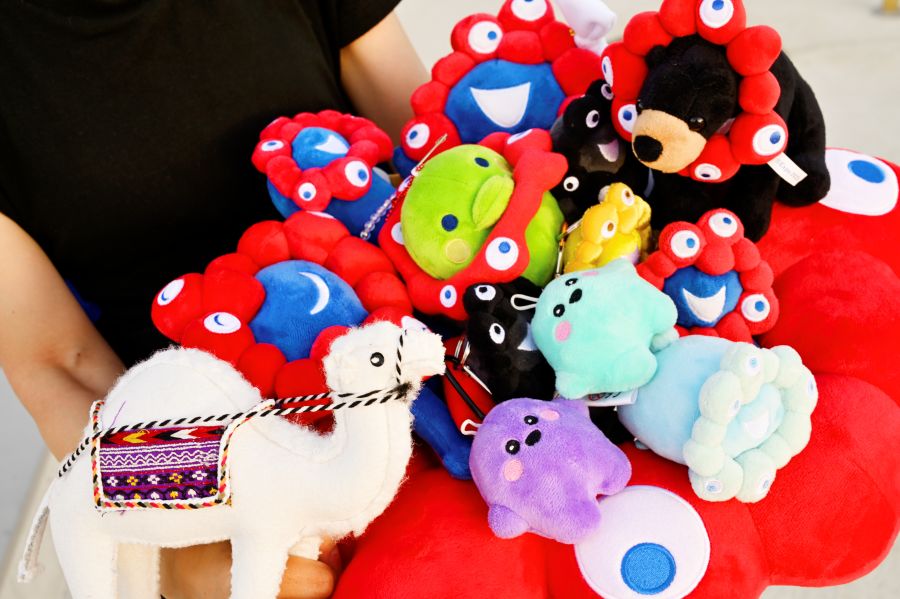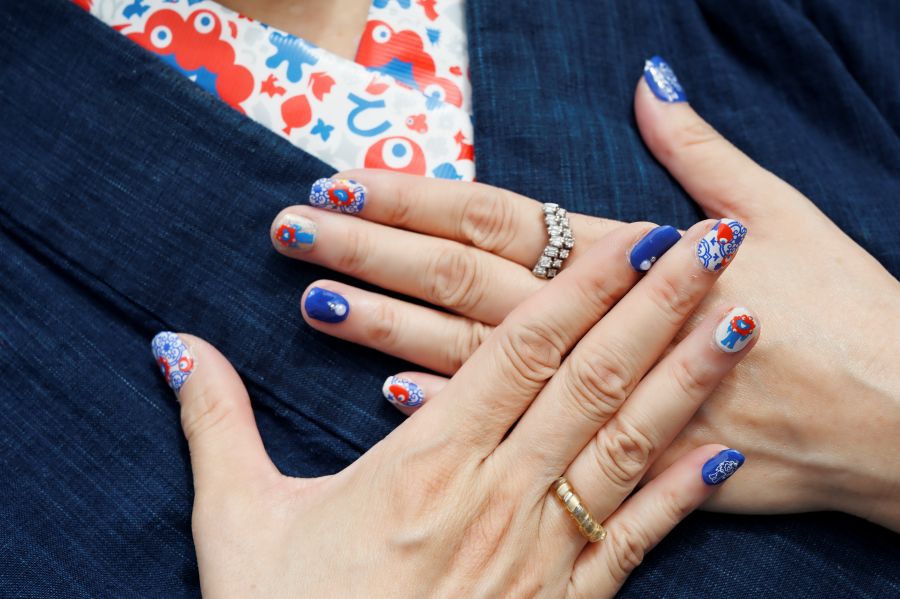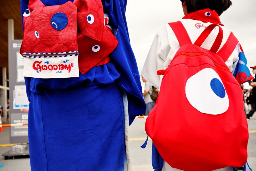 「ポルトガル・パビリオン」の近くでは、ステキな藍色の着物に日傘の女性を発見。普段から和装を楽しんでいるというこの方、市販のミャクミャクの手ぬぐいを活かし、帯にしたそう。ナイス・アイディア!よく見ると、半襟や、ネイルもしっかり、ミャクミャク柄。粋でセンスの良い上級者着物コーディネートだった。