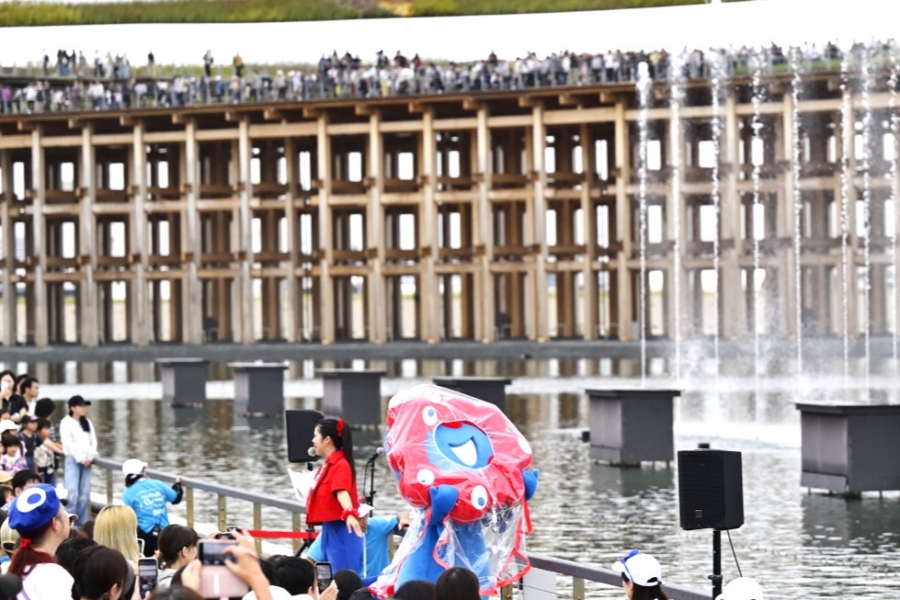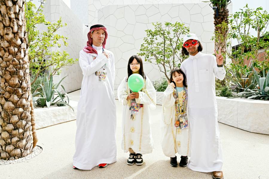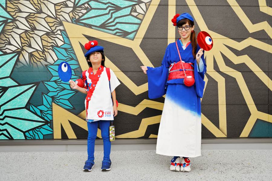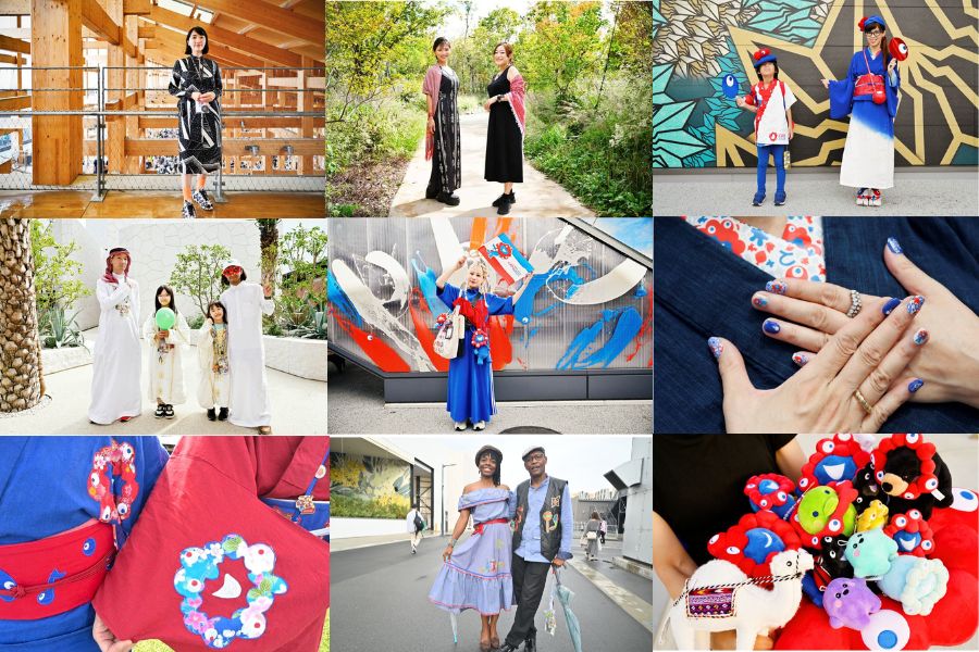 「西ゲート」ちかくでお洒落な和装の親子をキャッチ。ミャクミャクモチーフを取り入れた頭から足先、小物に至るまでこだわった、「こんなのみたことない!」と驚くようなオリジナリティとセンスにあふれた和装は、海外パビリオンでも大人気に。ある日「ポーランド・パビリオン」では、「こんなに素敵な来場者が!」とスタッフが大喜びで迎えてくれ、記念撮影大会がはじまったそう。アーティスト・BAKIBAKIさんが手掛けた和な壁画にもぴったり。