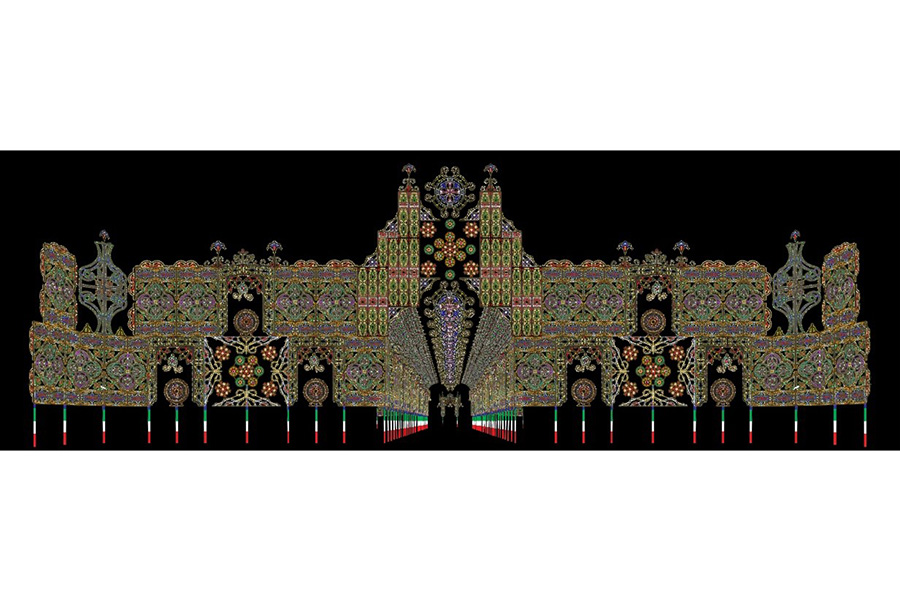 また「旧外国人居留地会場」では、「三井住友銀行」神戸本部ビル前広場の三方を囲うように高さ約7m、幅約16mの箱型作品「ドッピオガゼボ」を設置。そして「メリケンパーク」では、南東の緑地通路に延長約75mの光の回廊「ガレリア」、その入口には幅約48mの玄関作品「フロントーネ」が並ぶ。このエリアは作品をゆっくりと鑑賞できる有料エリアになる。