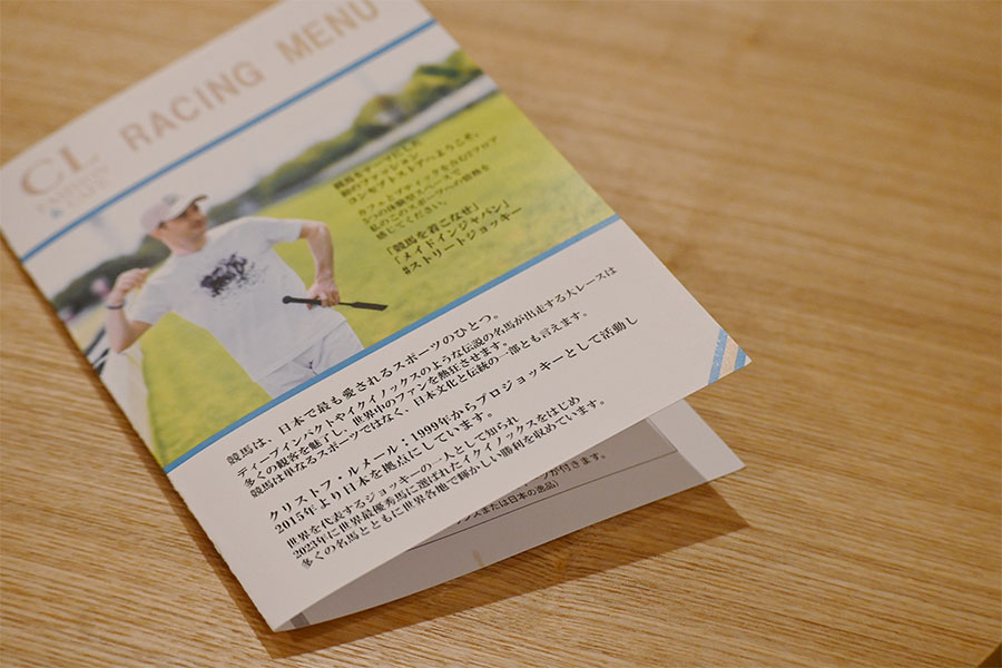 京都在住のクリストフ・ルメール騎手が創設したファッションブランド「CLbyC. ルメール」初の旗艦店は、1階のカフェも抜かりなく「競馬」がコンセプト。内装は競馬要素が満載で、メニューにもルメール騎手ならではの思いやアイディアが込められている。