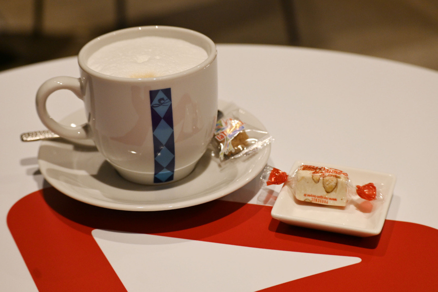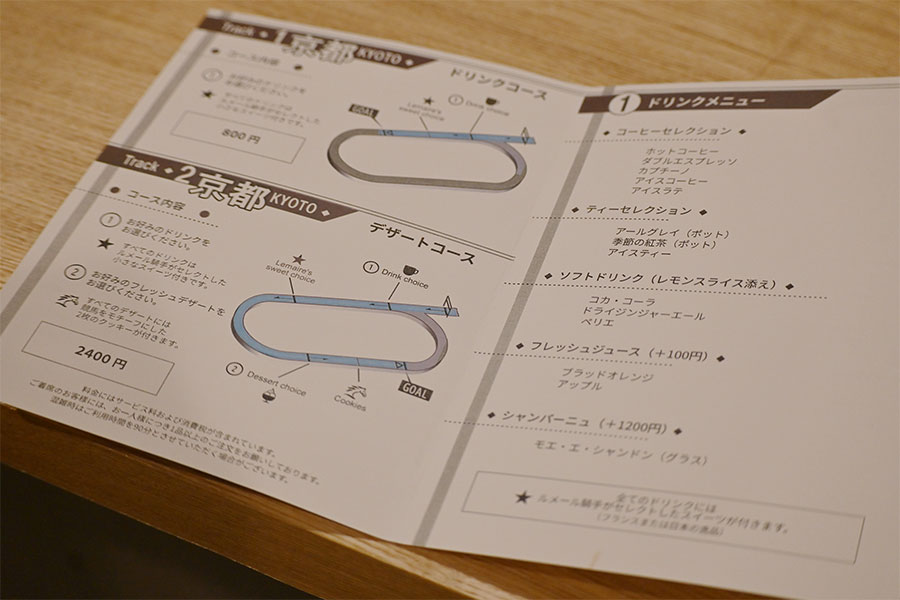カフェではドリンクコースとデザートコースがオーダー可能。その内容をターフのイラスト入りで図解するメニューも遊び心満載だ。ドリンクコース(800円)は、カプチーノやポットサービスティーなどから選べるドリンクに、ルメール騎手がセレクトした小菓子と2枚のクッキーが付く。デザートコース(2400円)は、さらにスイーツ1種がプラスできる。