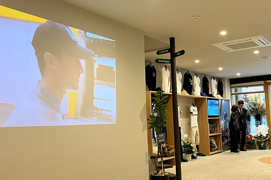 その前に並ぶのは、白地に赤でナンバリングされた丸テーブル。競馬ファンにはお馴染み、ゴールから1ハロンごとに立てられるハロン棒がイメージされている。芝を思わせるグリーンのベンチシートに置かれたクッションはゼッケンがモチーフ。腰かけて、プロジェクターから投影されるレースの映像を眺めていると、競馬場に居るような気持ちになってくる。