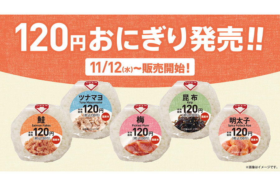 物価上昇が続く中でも「おいしく、無理なく続けられる食生活」を応援したいと開発された「120円おにぎり」(税込130円)。海苔なしタイプで、定番人気の具材である鮭・梅・ツナマヨ・昆布・明太子の全5品が揃う。