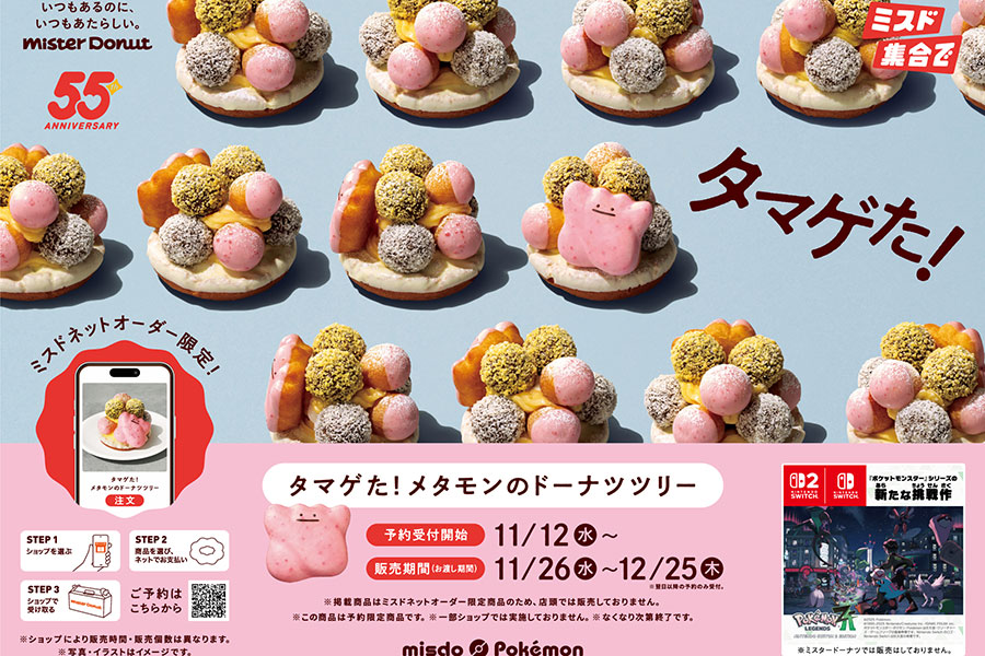 ドーナツチェーン「ミスタードーナツ」(本社:大阪府吹田市)は、11月5日より「ポケモン」とのコラボ企画を実施中。新たにネットオーダー限定の新商品「タマゲた! メタモンのドーナツツリー」が登場し、11月12日より予約受付がスタートする。