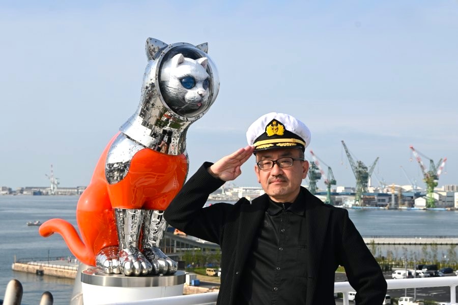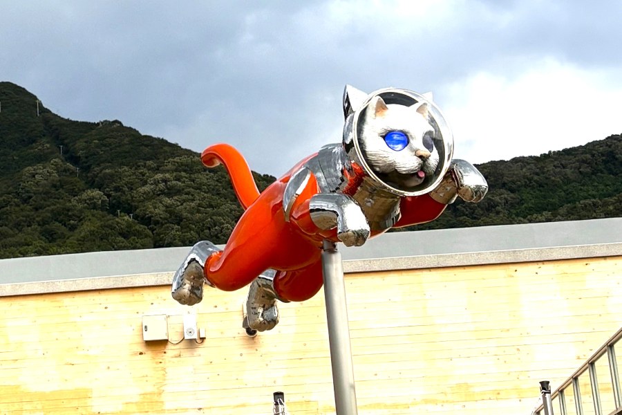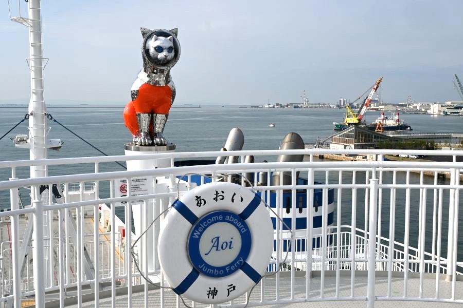 なお、ヤノベケンジ氏の「SHIP’S CAT」シリーズは「大阪中之島美術館」前に展示されている「SHIP’S CAT (Muse)」のほか、現在、『瀬戸内国際芸術祭2025』の参加作品として、神戸-小豆島ー高松を結ぶジャンボフェリー「あおい」の船上に乗船している「SHIP’S CAT (Boarding)」が、小豆島の坂手ポートターミナル「さかてらす」の屋上には、船に飛び乗ろうとする「SHIP’S CAT(Jumping)」がいる。