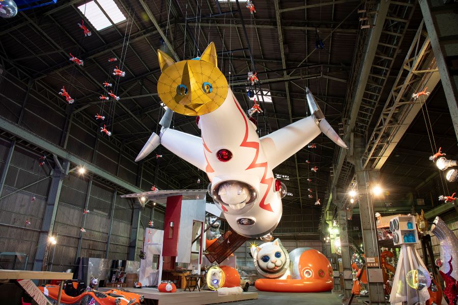 こちらは茨木市出身の現代美術作家・ヤノベケンジ氏が手掛けた猫耳を持つ太陽の塔型宇宙船「LUCA(ルカ)号」を中心とした、「船乗り猫」をモチーフにした「SHIP’S CAT」シリーズ作品によるインスタレーション。この「LUCA号」は今回の特別開館以降、解体・分割され、クラウドファンディングの返礼品「宇宙船の断片」として、支援者のもとへ届けられるので、「LUCA号」の最後の姿を見るチャンスを、お見逃しなく。