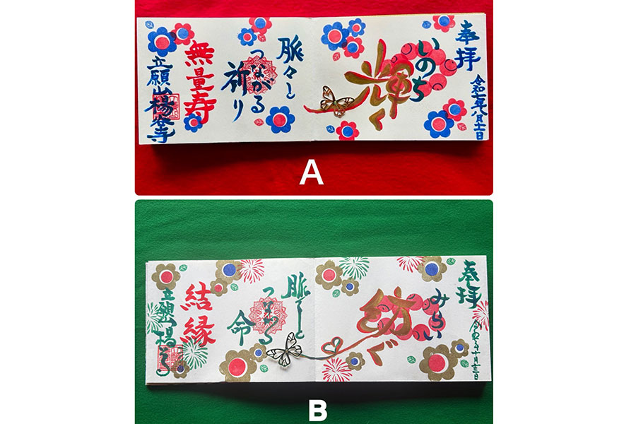 デザインは、赤・青・金の3色が使用された「A〜いのち輝く脈々と繋がる御朱印~」と、緑・金・赤・青の4色で彩られた「B~未来を紡ぐ御朱印~」の2種類(各2500円)。いずれも、花がちりばめられた愛らしいデザインとなっている。