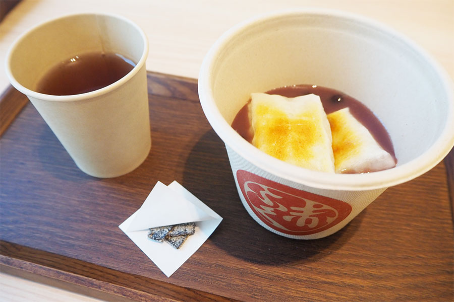 喫茶メニューはワンコイン(500円)のあずき茶をはじめ、「お菓子とドリンクセット」(800円)には、パイ生地に粒あんと和三盆クリームを詰めた和洋折衷な菓子「あずきコルネ」や季節限定「さつま芋コルネ」がスタンバイ。「赤福」ブランドらしい季節限定「赤福ぜんざい」(800円)も楽しめ、難波の店舗とは異なる軽い素材の器で使い勝手のよさを意識したそう。夏には同百貨店の催事出店の際に大人気だった「赤福氷」も提供される。