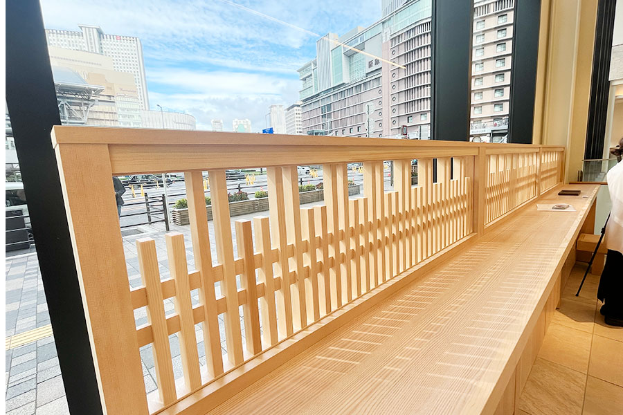 新店の喫茶スペースは、1人でも利用しやすいカウンター席&スタンディングの約35席で、ガラス窓から梅田の風景を望める開放的な空間。担当者は「難波の店舗は地下にあり、ファミリー層が落ち着いてお茶できるテーブル席もありますが、こちらは人通りの多い1階。買い物途中での小休憩や、ステンディング席もあるので、より気軽に利用していただけたら」と話す。