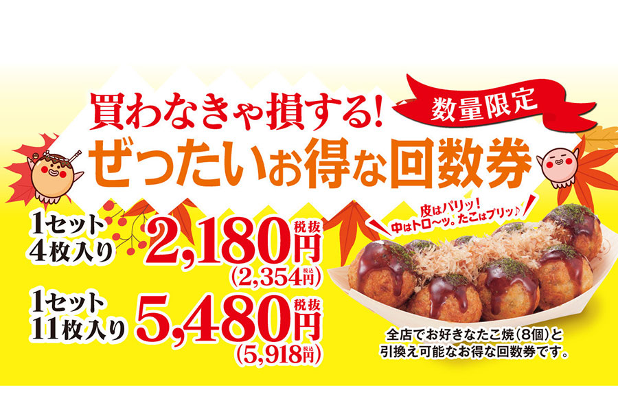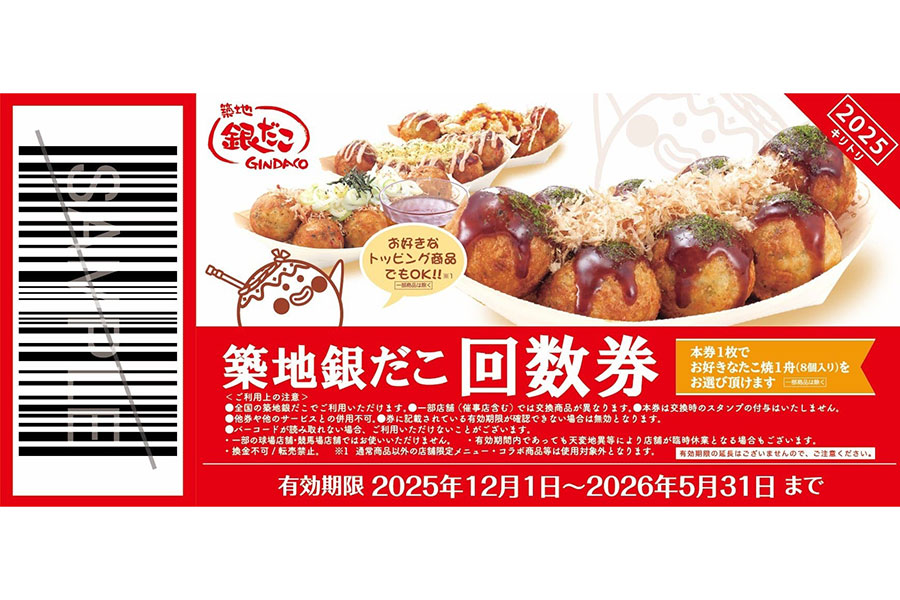 たこ焼きチェーン「築地銀だこ」(代表:佐瀬守男)から11月18日、期間限定で「ぜったいお得な回数券」が登場。最大で2794円お得にたこ焼きを購入できる。