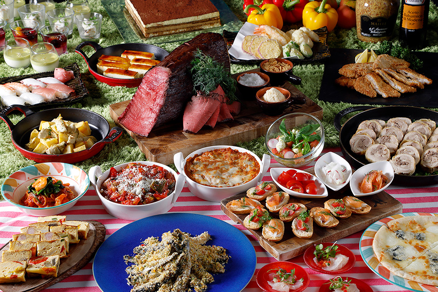 イタリア料理をテーマに、パスタやピッツァから、ティラミス、10種類のジェラートまで、イタリア各地の郷土料理が勢ぞろいする。ほかにも、国産牛ローストビーフや、海鮮があふれる「こぼれ巻寿司」、目の前で揚げる天ぷらを含む、40種類以上が食べ放題。平日の昼に限り、時間無制限で満喫できる。
