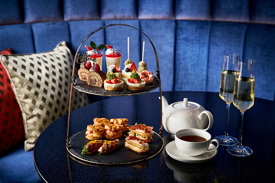 大阪メトロ「西梅田」駅から徒歩6分。四ツ橋筋沿いのオフィス街にある、デザイナーズホテルでは、ホテルでありながら4900円でアフタヌーンティーを食べられる。クリスマスをテーマにした今回は、いちごのショートケーキやパンナコッタなど、5種類のスイーツが登場する。スコーンにも、いちごとホワイトチョコが入っている。