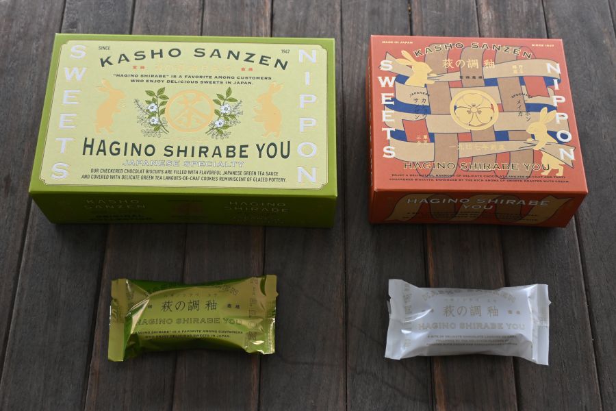 さらに同店では、市松模様にゆい上げたショコラクッキーに、日本茶の特製ソースを仕込んだ緑茶のラングドシャ「萩の調 釉 日本茶」も販売。口に入れると、中から香り高い日本茶がトロッと出てきて面白い。
