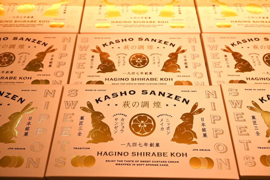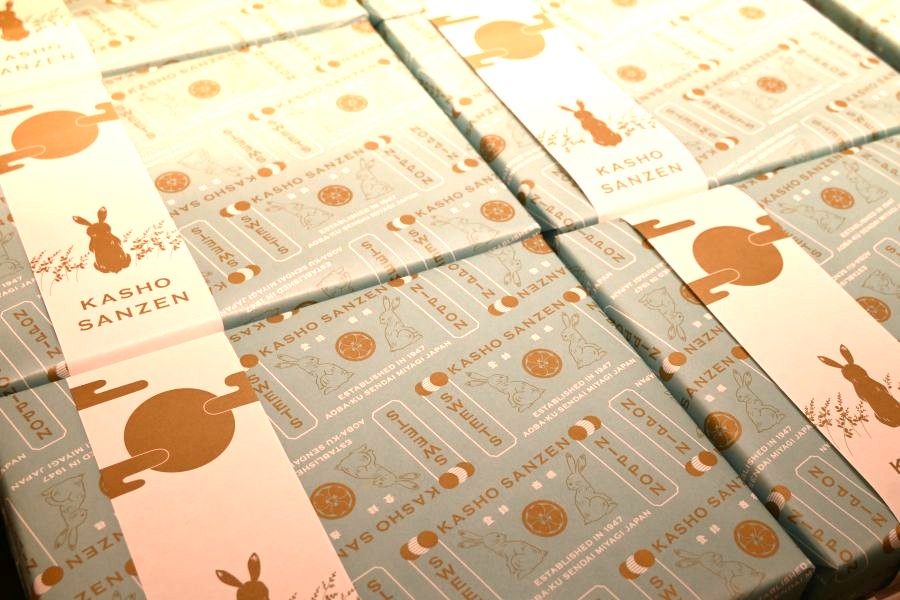 担当者が「白はものごとのはじまりを意味します。真っ白にこだわった新しい時代の銘菓を目指して作りました」と話すとおり、その中身だけでなく、ウサギのイラストを金色の箔押しで表現した、和モダンなパッケージも目を引き、従来の「萩の月」と全く違う印象を受ける。