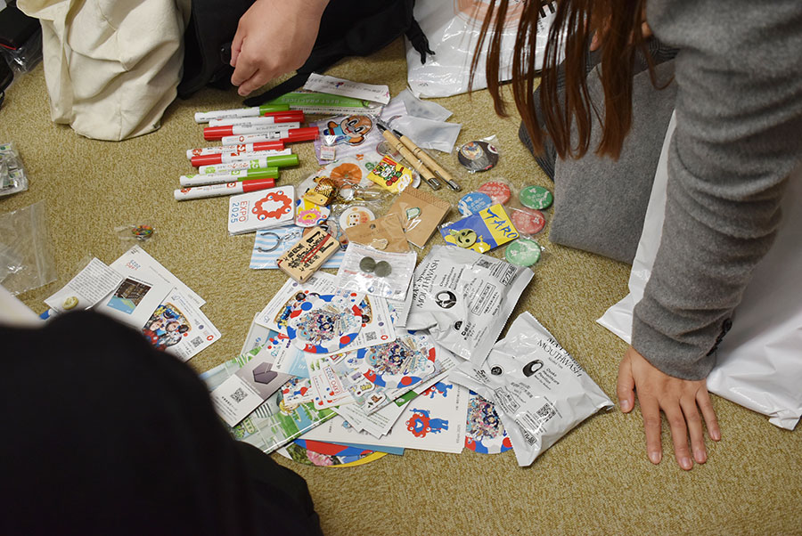各テーブルを見ていると、ぬいぐるみや缶バッジ、パンフレットなどグッズの種類はさまざま。また、パビリオンや会場内イベントで配布されていたエコバッグや紙袋、ポストカードなどのノベルティを並べている人もいた。