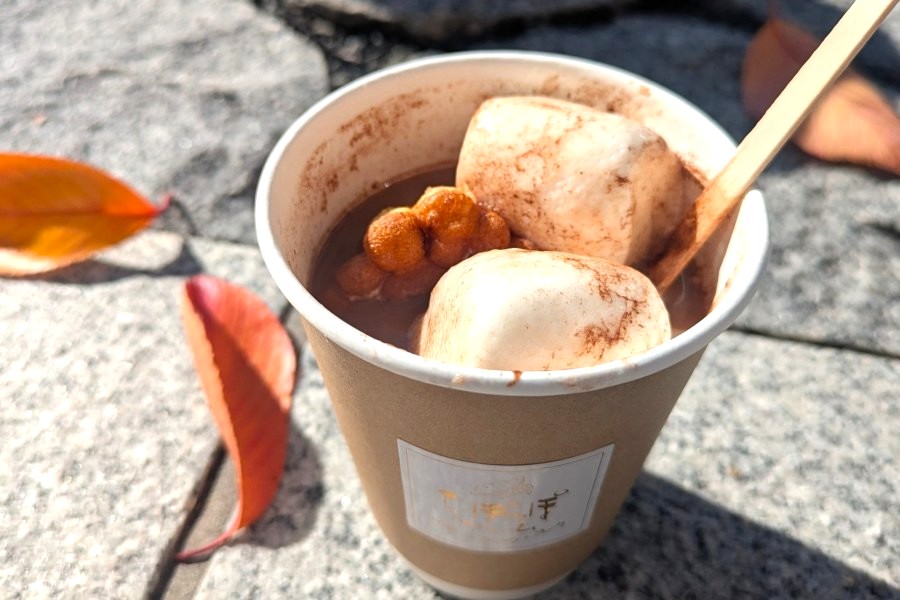 さらに、担当者おススメの食べ方も伝授してもらった。別売りの、マシュマロにチョコソースのかかったココアに、ミャクミャク焼きを浸して食べる、というもの。早速トライしてみると、最初は笑顔でココアの泉に浸かっていたミャクミャクだが、飲み進めるとどんどん沈んでいき…最後は完全に泉に帰って行ってしまった。冬らしいココアひたひたのミャクミャク焼きもおいしいので、ぜひトライを。