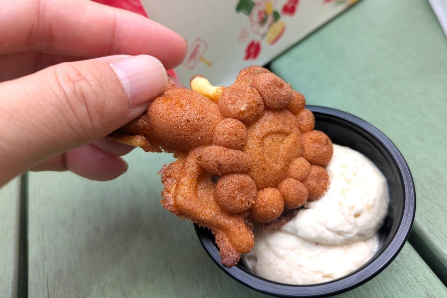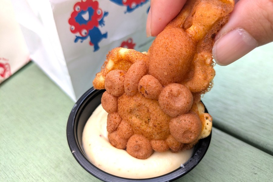 ミャクミャクの体には、サツマイモの角切りが入っていて、やさしい甘さ。『おいもホイップ』、『おいもフロマージュ』どちらのフレーバーにも、とてもよく合う。頭からディップすると、しっかりしたテクスチャーの『おいもフロマージュ』は完全にディップソースに突き刺さる形に…。
