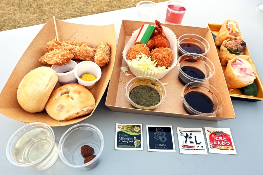 • この日限りのコラボレーションメニューも多数。左が新生公司の神戸ポークスティックヘレカツ&レコルトのパンセット、中央が「スペシャルソースで味わう神戸洋食プレート」。お酒は下が「安福又四郎商店」日本酒マリアージュセット、上が「櫻正宗」のさくらREDSWEET11など(11月8日/東遊園地)