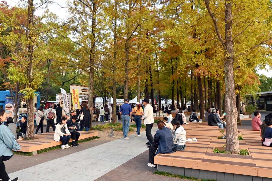 • 並木道にも出店が。ベンチでくつろぐ人たちも(11月8日/東遊園地)