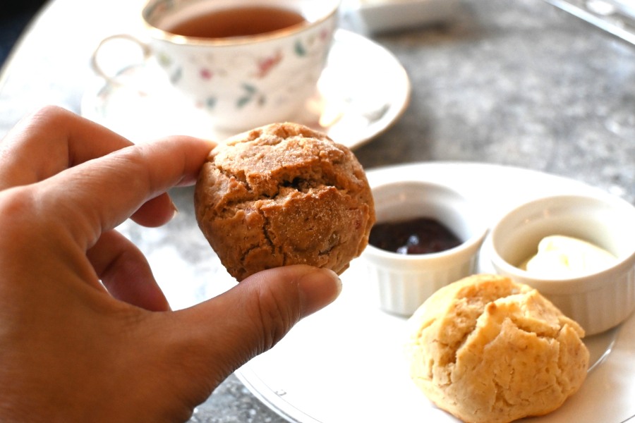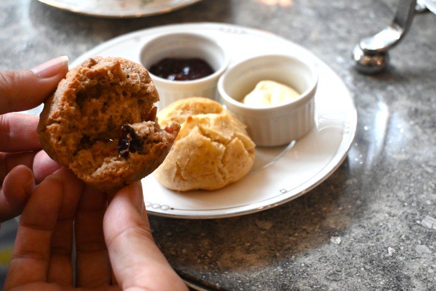 • 割ってみると、ドライフルーツなどがふんだんに。紅茶とよくあうスパイシーなスコーン。お好みでクロテッドクリームとジャムを「スイスホテル南海大阪」