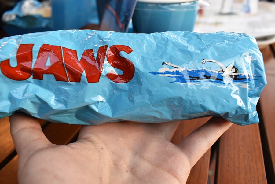 また、いずれも50周年を記念したスペシャルパッケージとなっており、アメコミ風の「ジョーズが迫りくる荒れ模様の海」をデザインしたボックス、そして「JAWS」のロゴがプリントされた鮮やかな水色の包み紙は遊び心たっぷり。