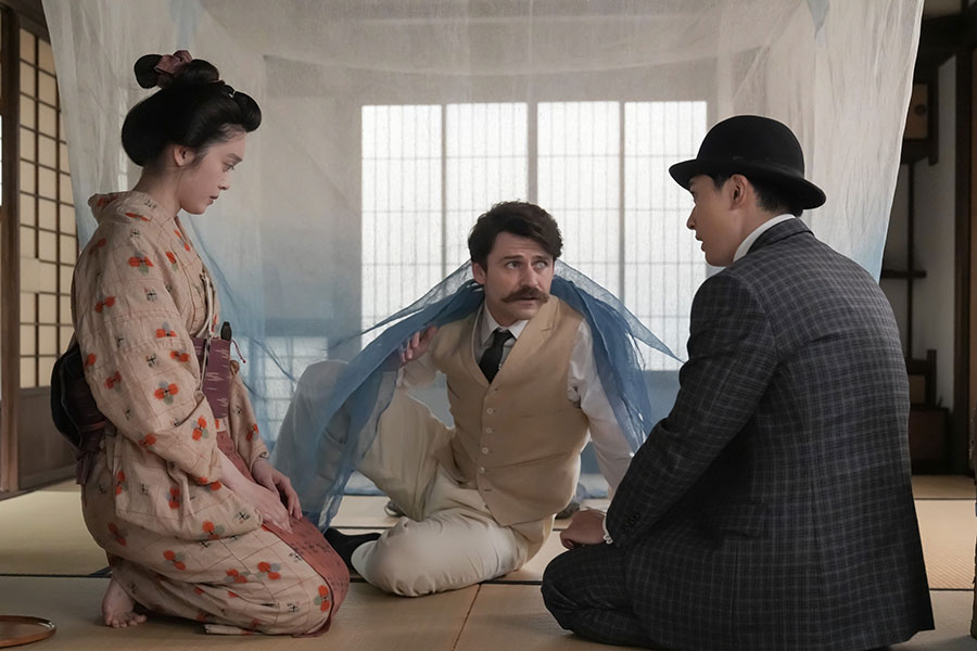 『ばけばけ』第39回より。蚊帳を出てトキたちと話すヘブン。写真左から、トキ(髙石あかり)、ヘブン(トミー・バストウ)、英語教師・錦織(吉沢亮)(C)NHK
