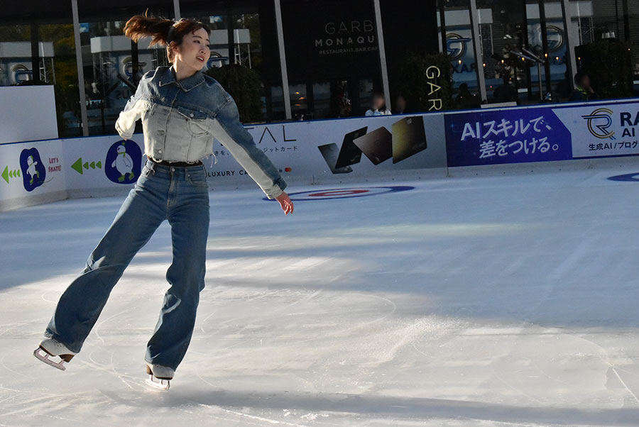 今回はデニムのセットアップという比較的カジュアルな衣装を選んだ本田。「つるんつるんの魅力のひとつが、しっかりした練習着じゃなくても私服のままでも滑れるところ。私自身も、大好きな洋服を着てスケートを滑る体験をしてみたかったのでこの服を選びました。遊び帰りでも仕事帰りでも、ぜひ滑ってもらいたいなという気持ちを込めました!」と同リンクをアピールした。