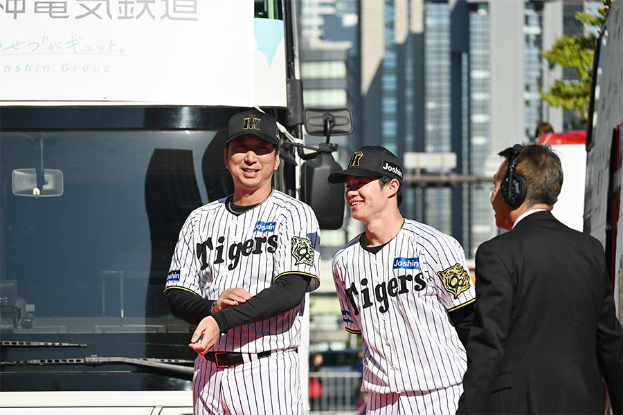 • 「阪神タイガース」選手会長の中野拓夢選手と笑顔をみせる藤川球児監督(11月22日 Lmaga.jp撮影)