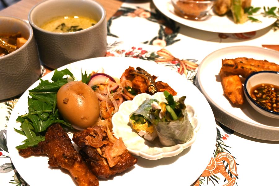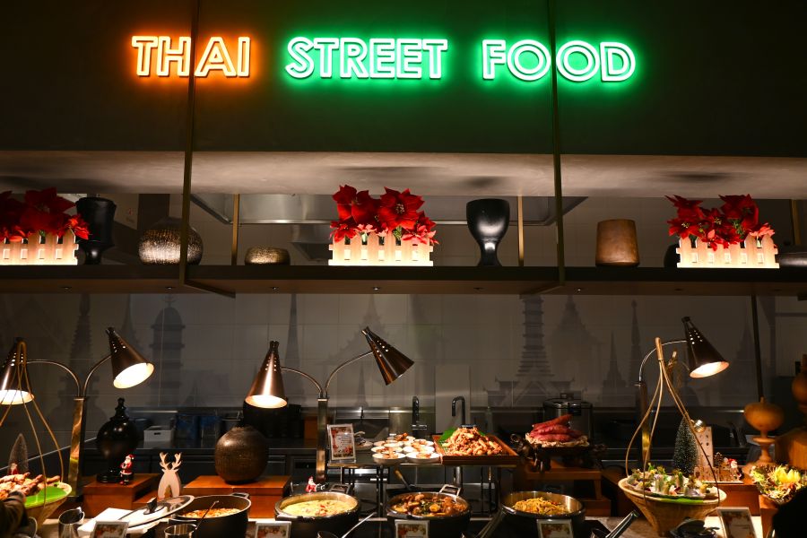 タイ料理コーナーには、クリスマスのチキン料理をイメージした「ハジャイ風鶏の唐揚げ」が登場。辛党にうれしい「グリーンカレー」や「牛肉入りスパイシースープ」といった現地出身のシェフによる奥深い味付けの人気料理も充実し、ライブクッキングで仕上げる「さつまいも揚げ」はピーナッツソースで本場流にいただくスタイル。