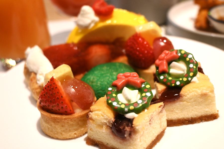 エントランスから目を奪われるスイーツコーナーは、ミニシューのツリーなどクリスマス感が満載。ペストリーシェフのジタさんが多彩なケーキを手がけ、ミニリースが愛らしい「ラズベリーチーズケーキ」は、やさしい甘味が魅力のアメリカンスタイル。ヨーロッパでおなじみのチョコ生地「ブラックフォレストケーキ」やアジア&洋風「マンゴー風味のブッシュ・ド・ノエル」といった、各国のスイーツ食べ比べが楽しい。